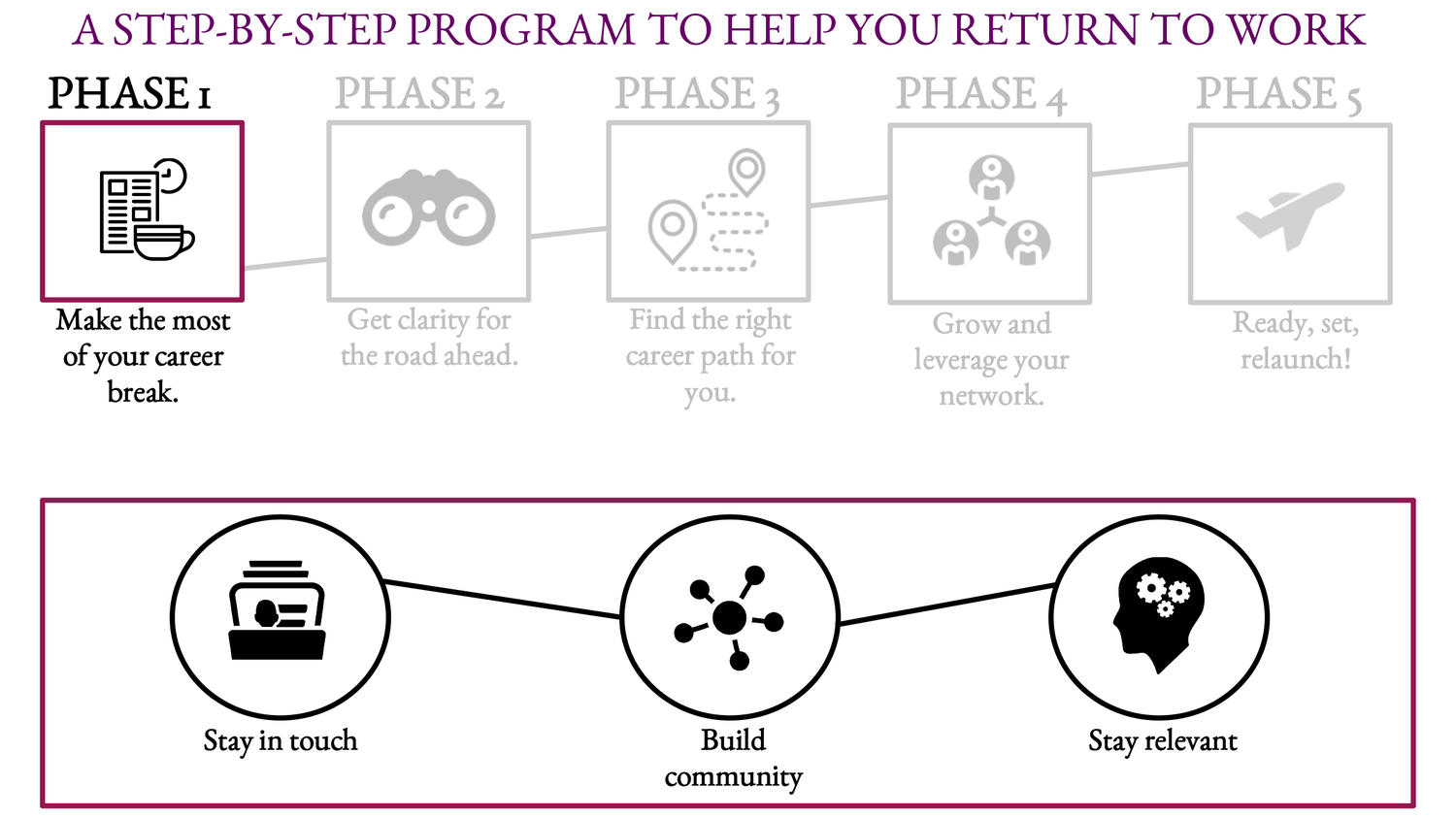 If you're thinking about returning to work, there are plenty of things you can do to keep you at the top of your game. Phase 1 shows you how to reconnect personally and professionally, maintain momentum through Lean In Circles and the iRelaunch Return to Work Community Forum. We'll show you how to stay relevant during your break.